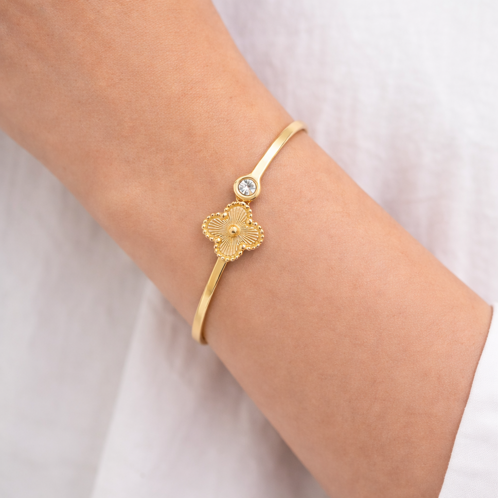 Featuring a finely textured gold clover motif paired with a delicate crystal accent, this bracelet symbolizes grace, positivity, and timeless beauty.