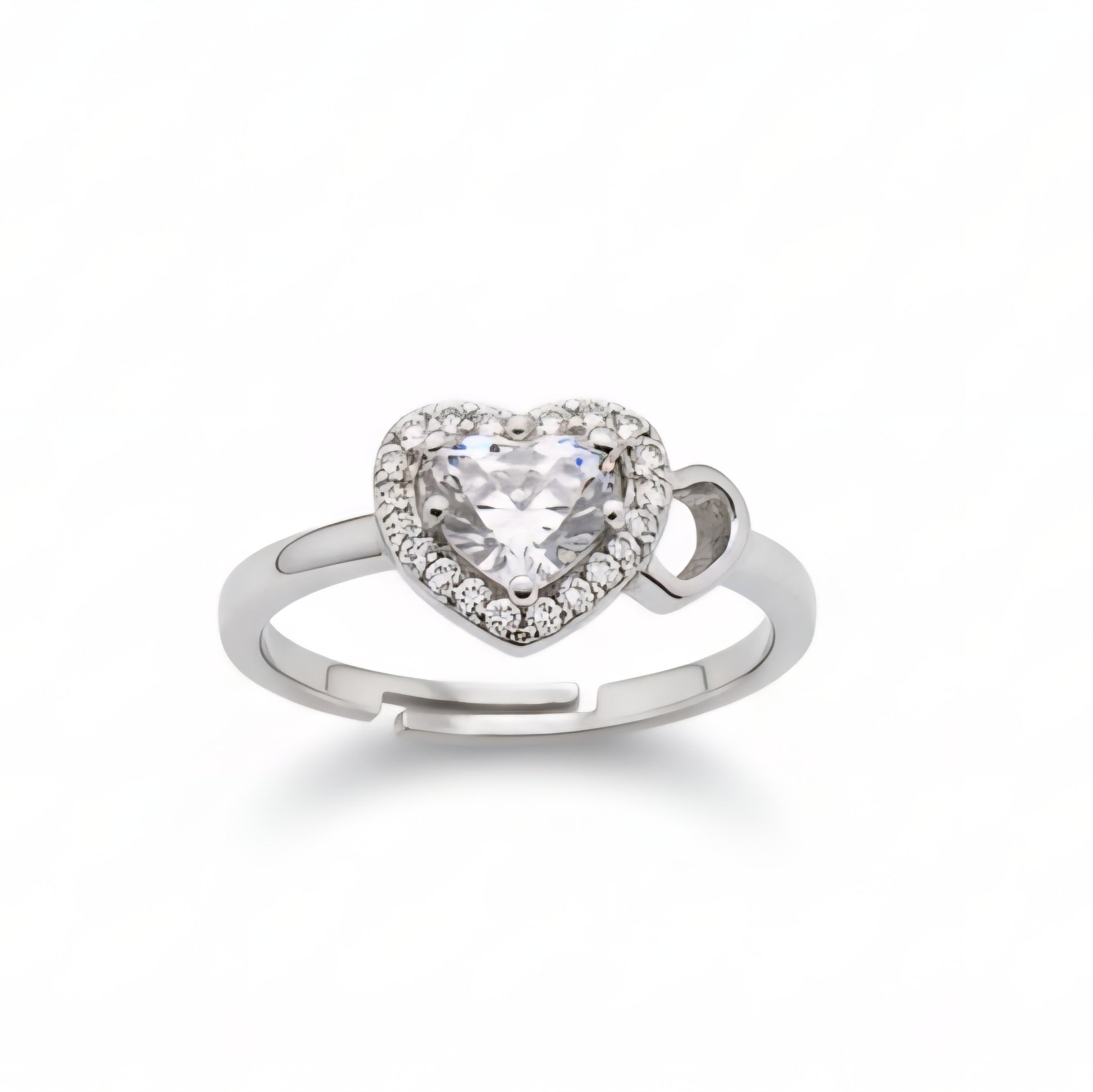Designed with a sparkling heart-shaped centerpiece framed by delicate crystal accents, this ring radiates timeless charm.